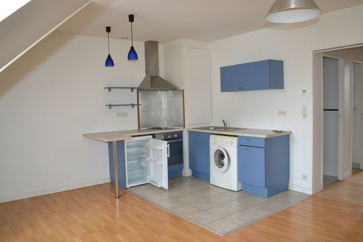 A Crozon, Joli petit appartement sous les toits (2ème étage sans ascenceur) en plein centre bourg de crozon composé d'une entrée desservant une pièce à vivre avec coin cuisine aménagée et équipée (four hotte, plaque électrique, réfrigérateur)