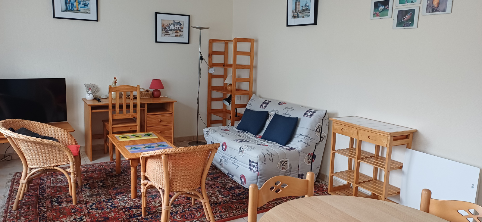 Joli petit appartement meublé de plain pied dans un quartier calme près des commodités, comprenant une pièce de vie avec coin salon-séjour et coin cuisine aménagée et équipée,