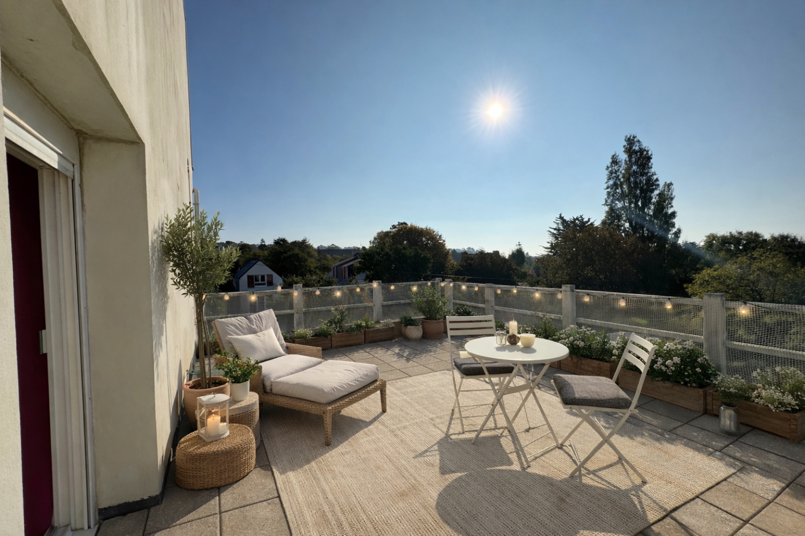 Situé au premier étage, celui-ci est composé d’un hall d’entrée qui dessert une pièce de vie ouvrant sur une grande terrasse exposée plein sud, ainsi qu’une cuisine séparée par une cloison (qui peut facilement être retirée pour créer une belle pièce de vie ouverte).