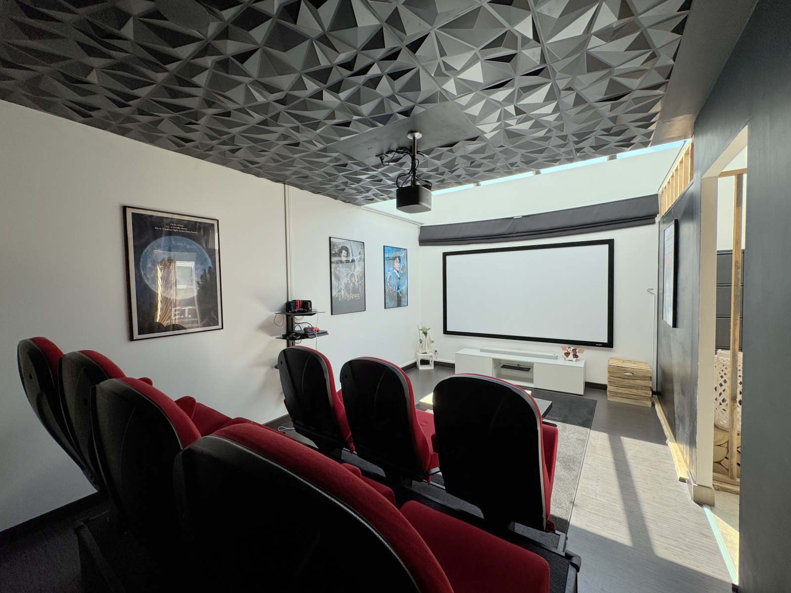 Une pièce coup de cœur : la salle de cinéma, pensée pour des moments de partage, avec des éléments authentiques qui rappellent les vraies salles obscures.